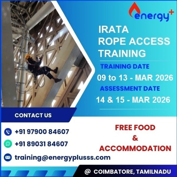 Dear All, Greetings from EnergyPlus!! Energy plus – Upcoming training program for the month of MAR -2026 mentioned below EnergyPlus delivers with commitment the IRATA training program and right time to upgrade your Rope Access Skill Levels. We invite you to attend our IRATA Training program in MAR – 2026 TRAINING DATES – 09th TO 13th MAR 2026 ASSESSMENT DATES – 14th & 15th MAR 2026 For further information’s & Bookings Please contact to Mob & W.APP #+91 97900 84607 & + 91 89031 84607 WhatsAPP : https://wa.me/qr/4FUYPAV4FXFNN1 Email: training @ energyplusss.com Location : https://g.co/kgs/CkE2Ssx